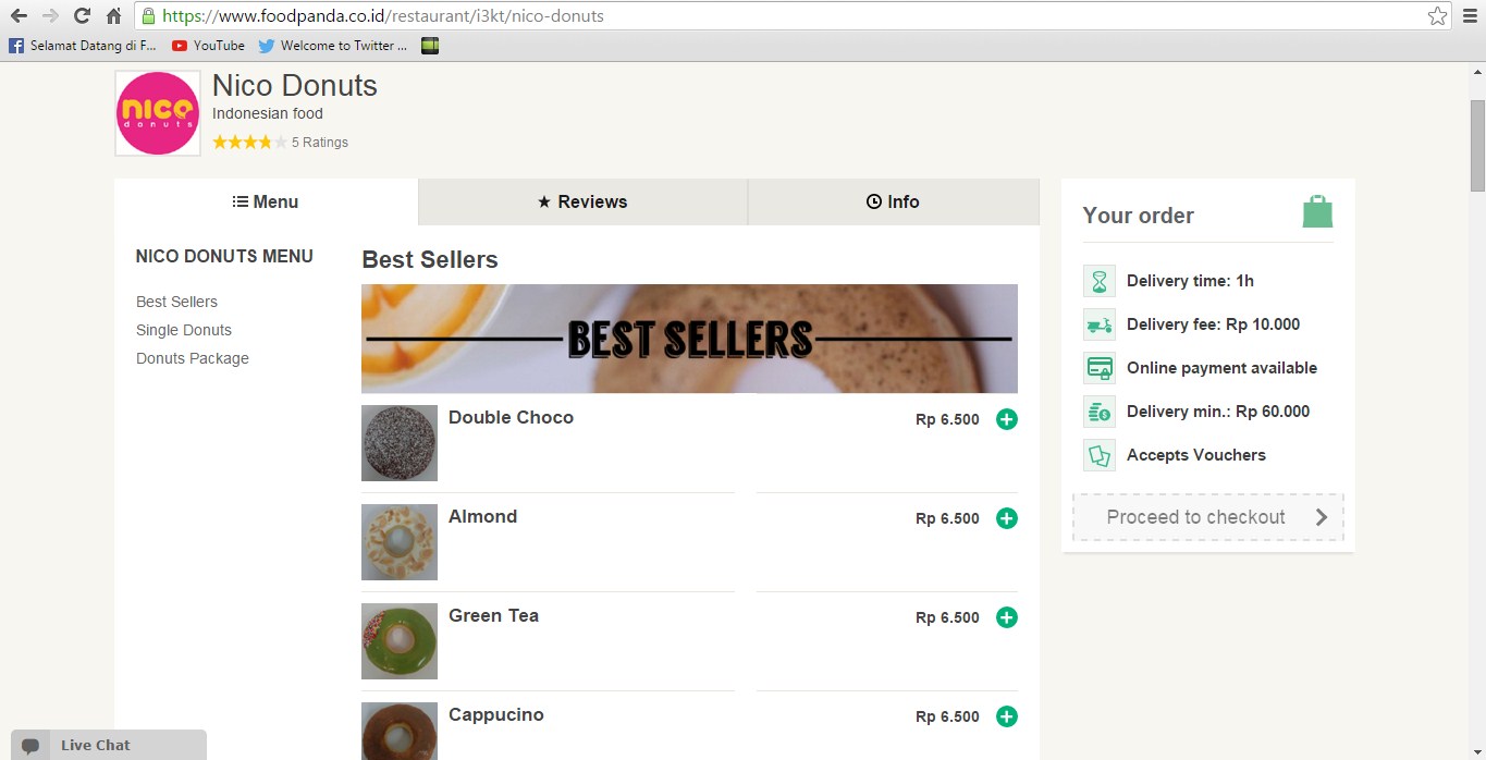 Langsung saja scroll ke bawah dan temukan makanan yang diinginkan. Jika ingin memesan langsung saja klik icon tambah di sisi kanan untuk memasukkanya ke dalam ordermu. Lalu dilanjutkan dengan memproses pemesananmu dengan mengklik tombol Proceed to Checkout.